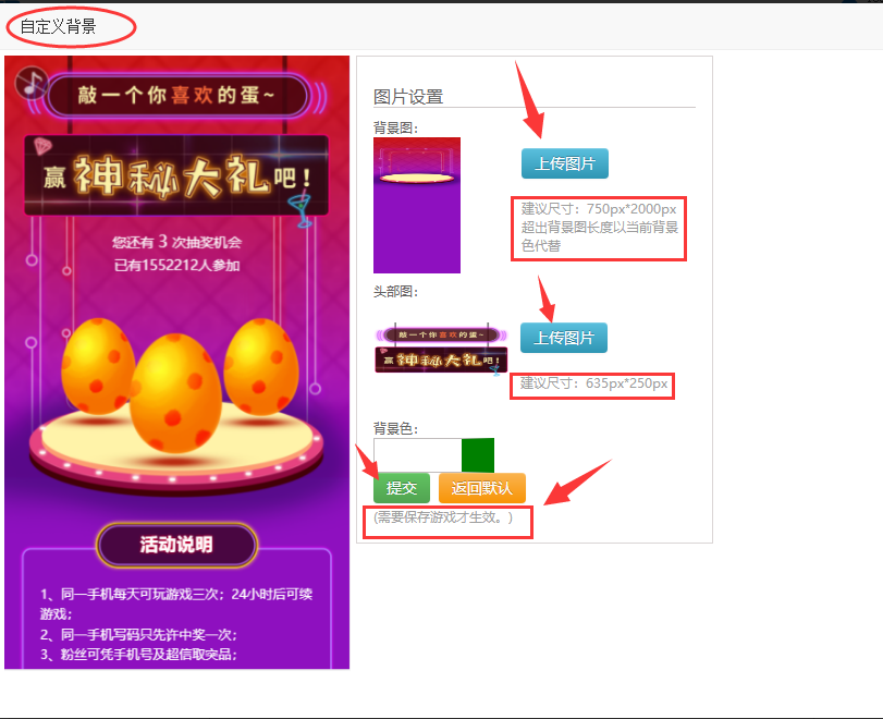重复抽奖时限和可抽奖次数按照实际情况设置,如设置24小时、3次,则代表一个用户在24小时内,拥有3次抽奖机会;生效时间指的是具体年月日,时间为当天几点生效;封面图片活动有需便自行上传即可,格式为JPG/PNG,推荐尺寸:360*200px;游戏背景音乐格式为MP3,若不上传,则会启用系统默认的背景音乐。