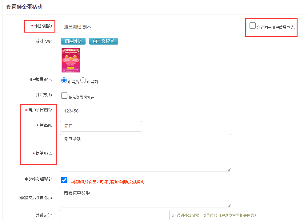 3、标题/期数按实际情况填写;允许同一用户重复中奖的意思是指当一个用户拥有多次抽奖机会时,刚好多次都中奖了,允不允许用户重复提交中奖信息;反之如果不允许同一用户重复中奖就无需勾选,那么当用户多次中奖后,也只能提交一次中奖信息,该活动只给予他一个奖品;