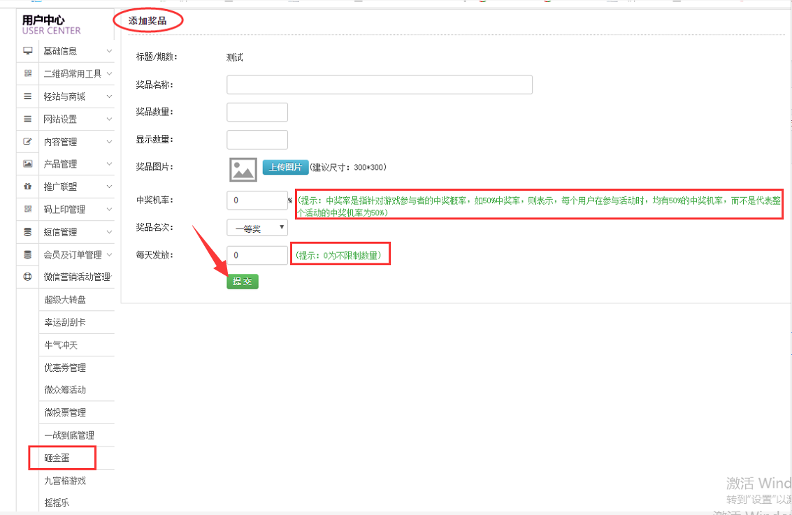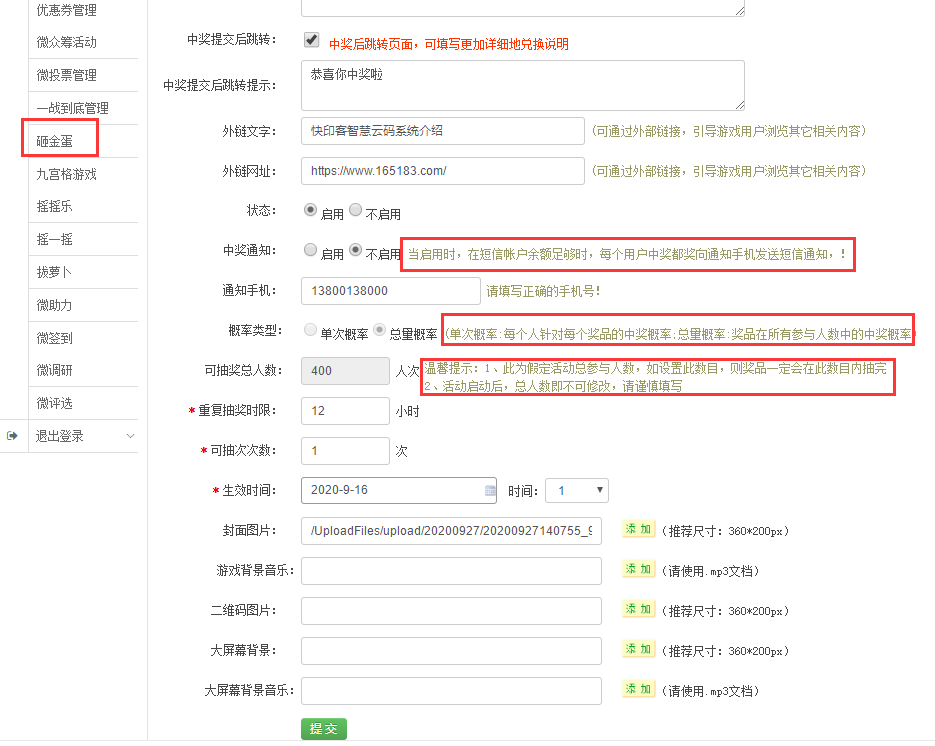 中奖通知和通知手机可根据实际情况设置启用和不启用。当启用时,在短信帐户余额足够时,每个用户中奖都奖向通知手机发送短信通知;概率类型可按自身需求选择单次概率或总量概率,单次概率是指每个人针对每个奖品的中奖概率,总量概率是指奖品在所有参与人数中的中奖概率,(关于游戏概率设置问题:建议选择总量概率。这样您就不用算各个奖项的比例了。系统会帮您自动算出。
