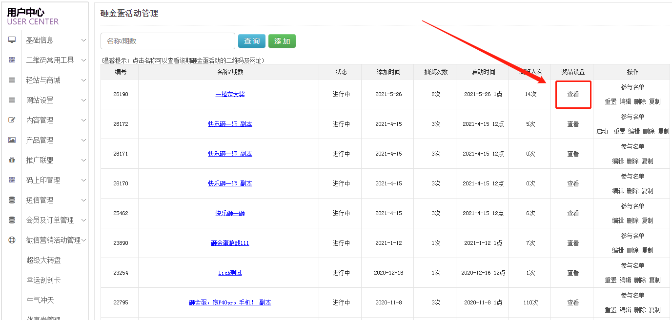 4、点击提交之后,返回砸金蛋活动列表界面,点击奖品设置处的“查看”去添加相应的奖品,如下图: