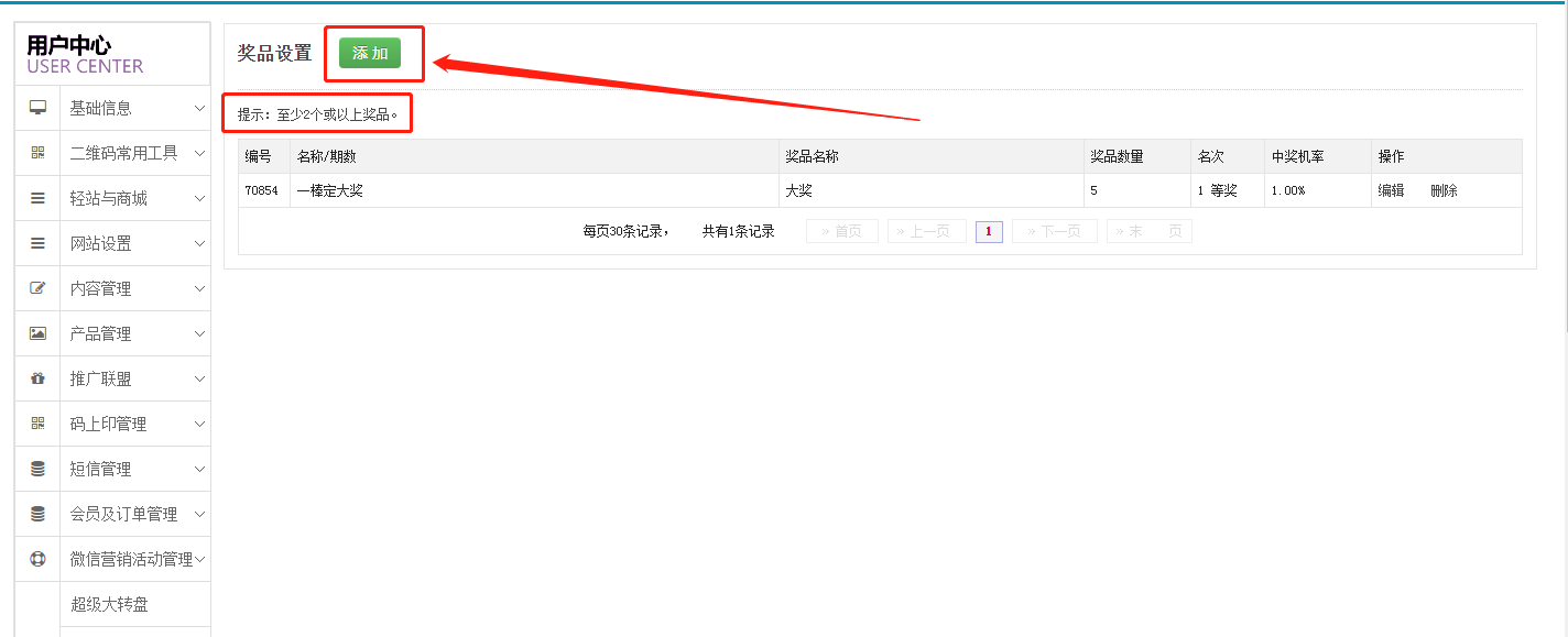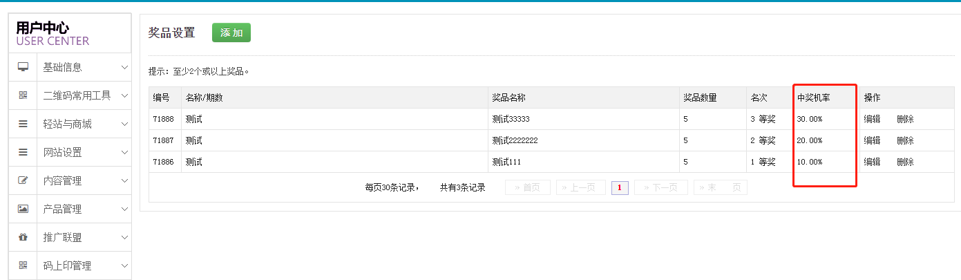 注意:存在多个奖品的情况下,请一定要确保多个奖品的机率≤100%。如下图: