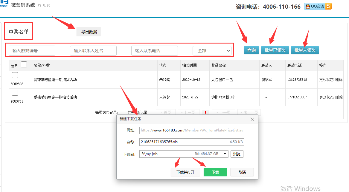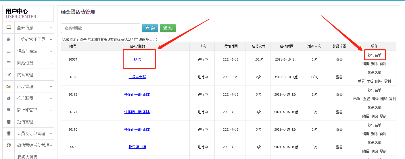 6.奖品设置完毕后,返回砸金蛋界面,可直接点击游戏名称查看二维码,扫码参与该活动;后期需要查看中奖信息,可点击中奖名单查看,也可把数据导出。如下图: