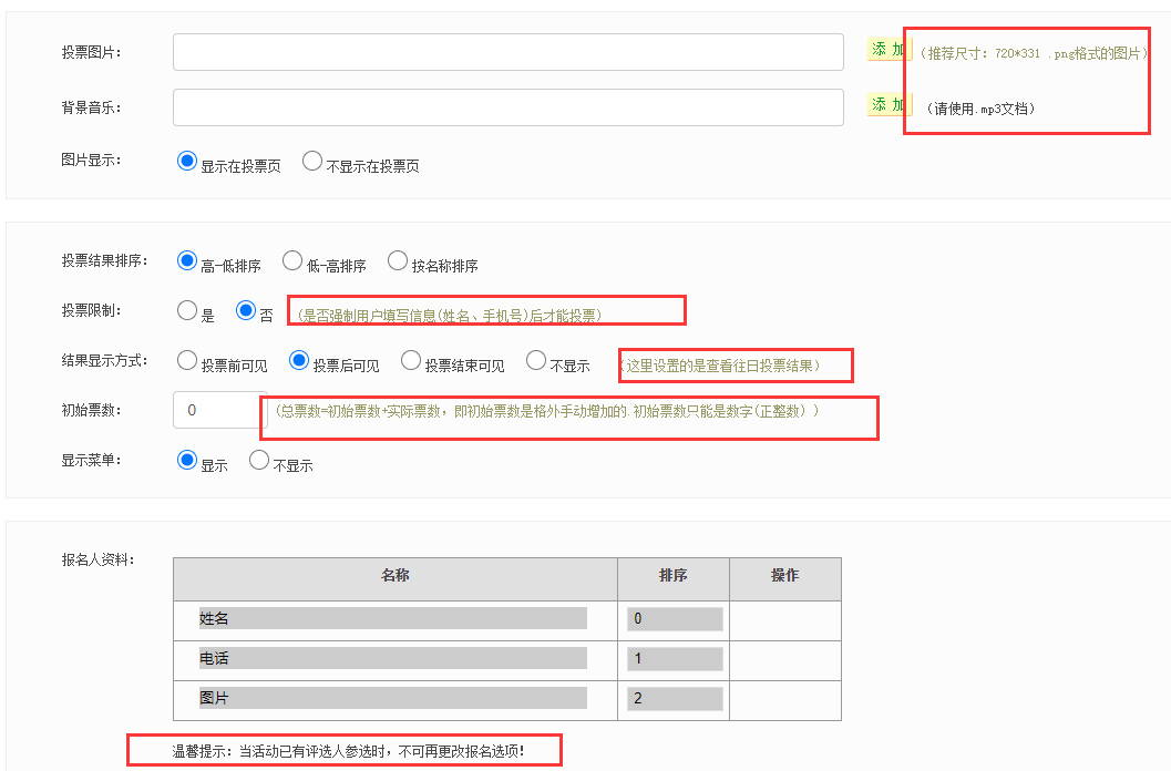 投票图片格式为PNG,推荐尺寸为720*331px;背景音乐为MP3格式,图片显示可以选择显示在投票页或不显示在投票页;投票结果顺序可以选择高-低排序,或是低-高排序,按自身需求设置;投票限制可以选择是或否,如果选择是,指的是强制用户填写信息(姓名、手机号)后才能投票;投票结果按自身需求来设置,这里设置的是查看往日投票结果;初始票数是额外手动增加的,初始票数只能是数字(正整数),总票数=初始票数+实际票数;报名人资料自定义可以通过添加选项来自定义设置。投票说明和奖品说明,投票流程按实际情况填写,以上信息设置完毕后,点击提交,如下图所示: