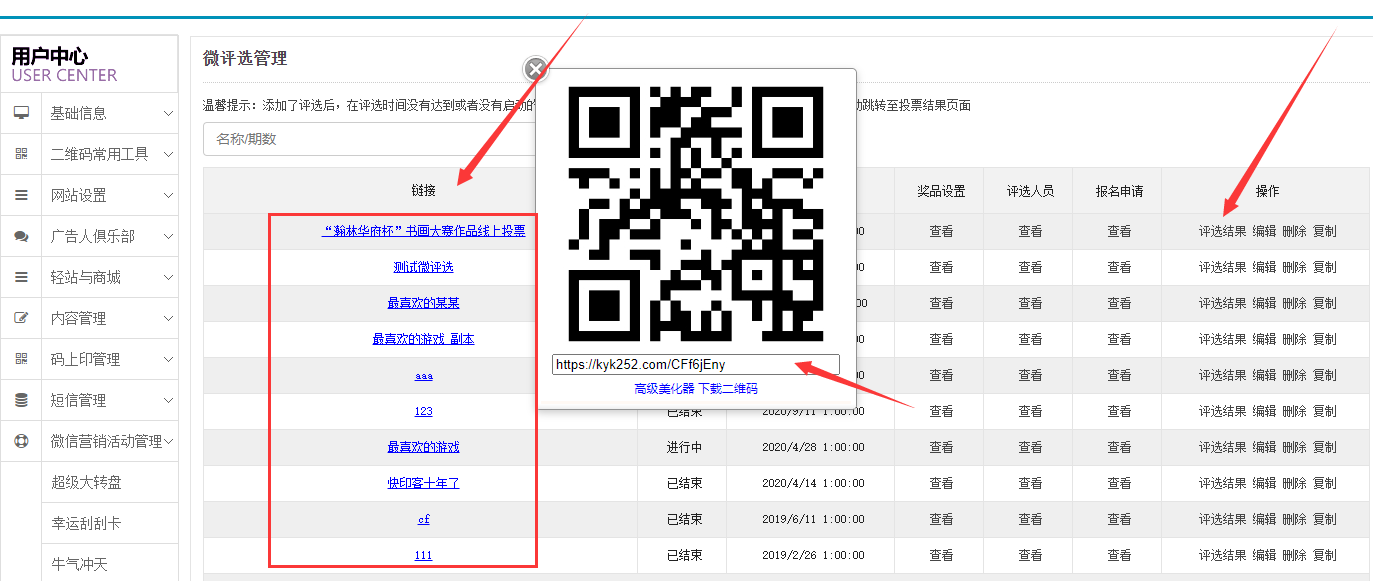 7、点击链接就是该评选活动二维码,扫码进行体验;如果需要查看投票结果,点击评选结果按钮即可查看。如下图所示:
