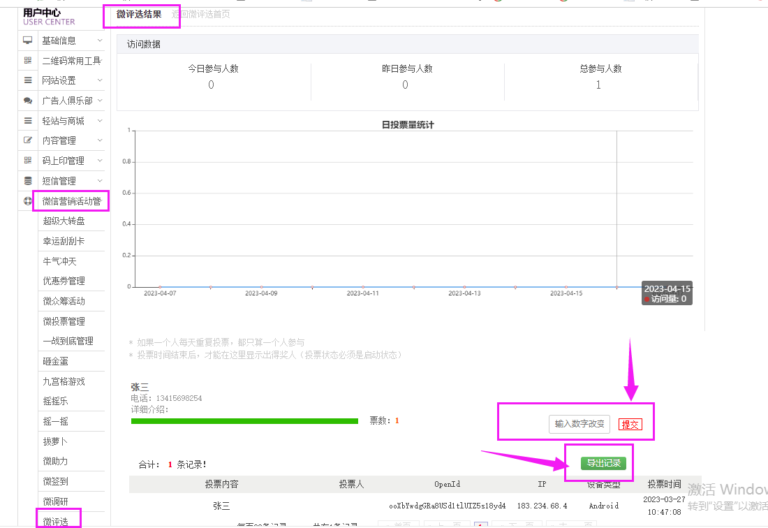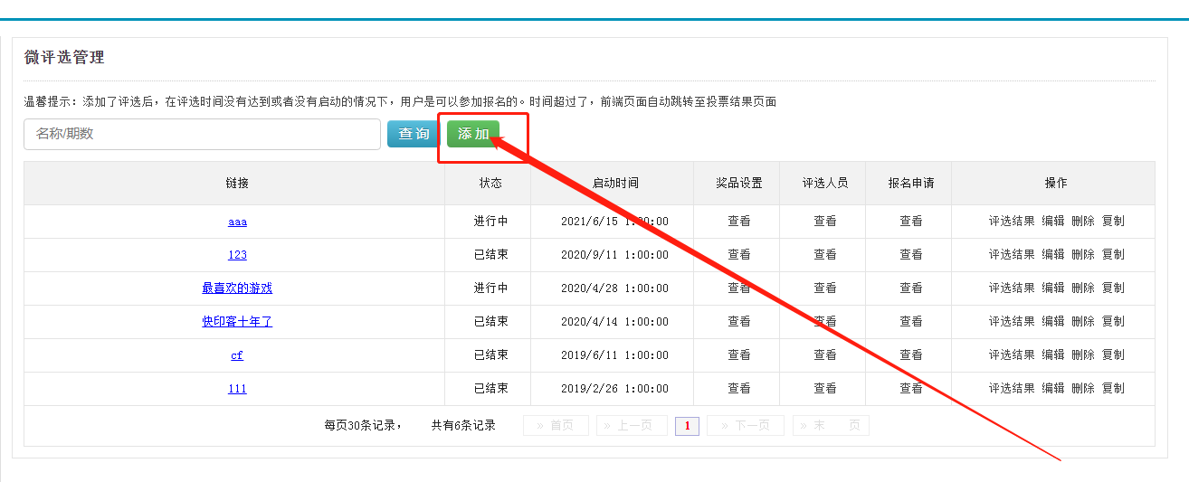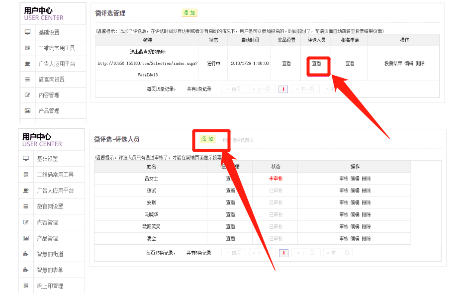 1、登录智慧云码系统,点击微信营销活动管理--微评选,点击添加,如下图所示: