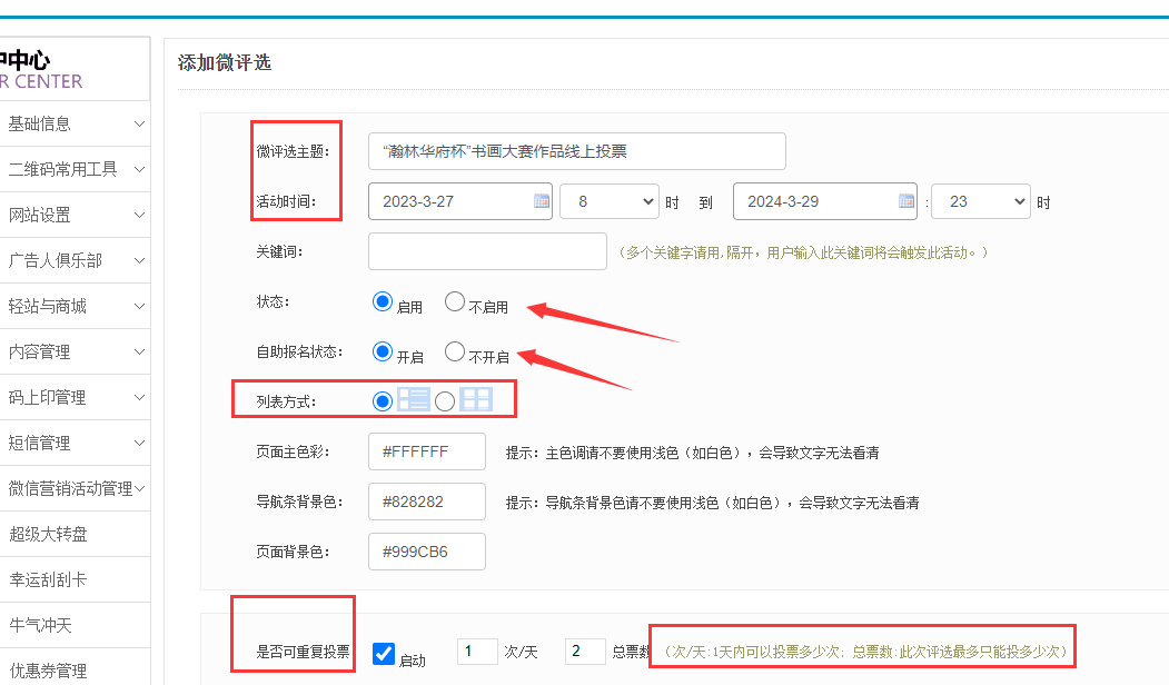 2、点击添加后,微评选主题按实际情况设置;状态选择启用;活动时间按实际情况设置;关键词建议设置成简短的词语,不建议设置成数字,怕后期游戏多了,关键词会重复,如果存在多个关键词,使用逗号隔开; 是否可重复投票如果打勾,则代表1天内可以投多少次。如下图所示: