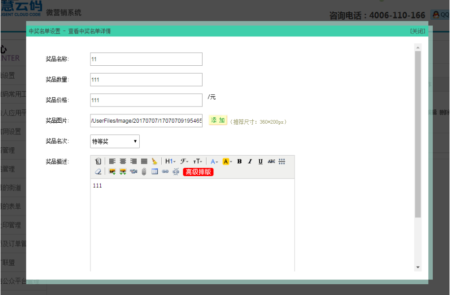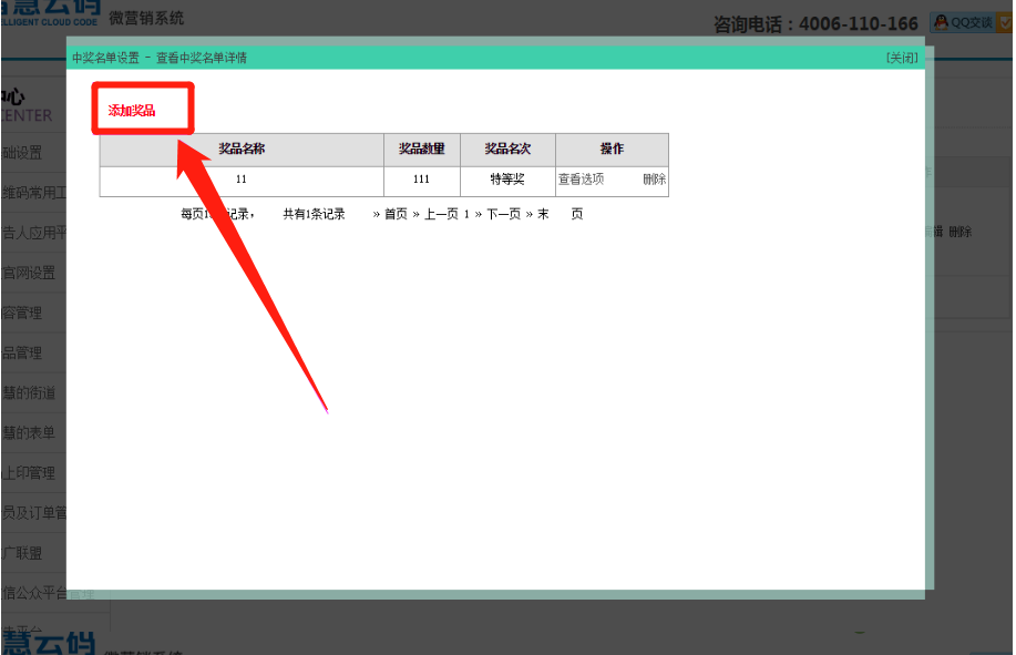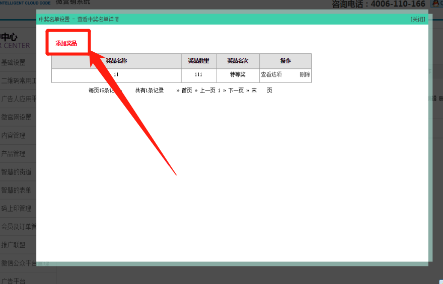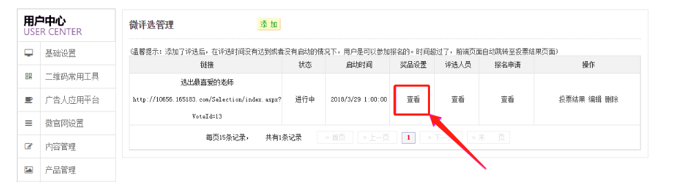 3、奖品设置,首先点查看按钮,进去添加奖品,根据自身活动情况一一填写,奖品设置完毕后,点击提交即可。如下图所示: