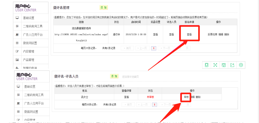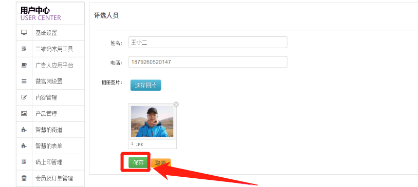 5、添加或审核评选人员:点击添加之后,姓名、电话按实际情况填写;相册图片格式为JPG/PNG。设置完毕后,点击保存即可。如下图所示:
