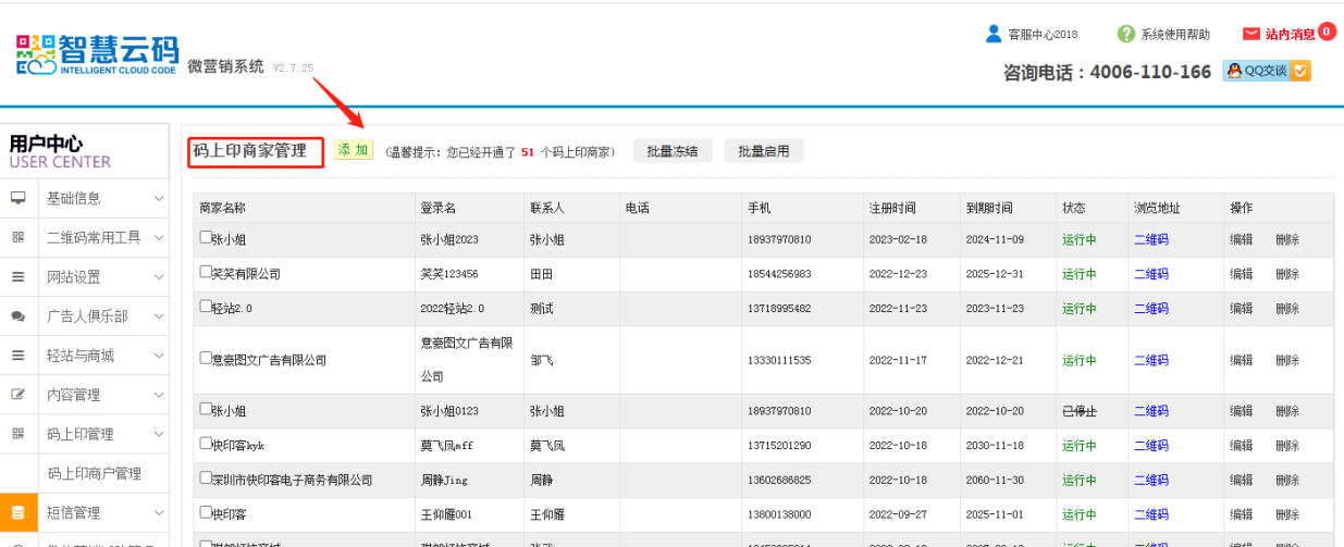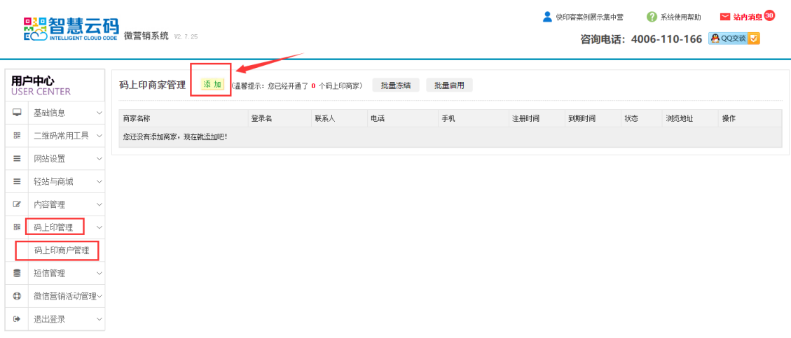 - 首先登陆智慧云码进入管理,点击左侧码上印管理栏目,点击码上印商户管理,点击添加,如下图所示: