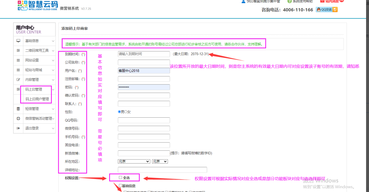 2、点击码上印商家管理添加按钮后,便会出来以下对应界面:包含公司名称、用户名、注册邮箱、密码、确认密码、联系人、性别、QQ号码、微信号码、手机号码、固定电话等信息,可自身根据实际情况对应填写即可;红色*号为必填项,其他信息可选填或不填写;权限设置则是给该子账户设置可拥有的系统工具/功能权限,如实按自身情况对应全选或是部分功能勾选即可;如下图所示: