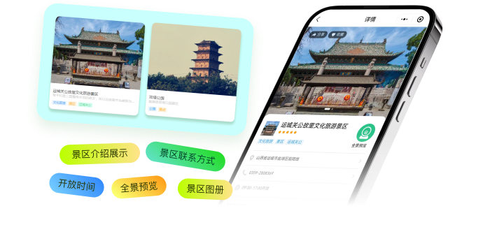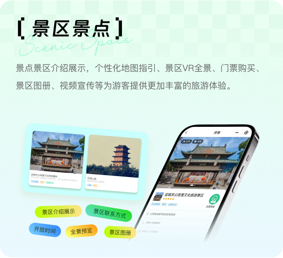 景点景区介绍展示,个性化地图指引、景区VR全景、门票购买、景区图册、视频宣传等为游客提供更加丰富的旅游体验。