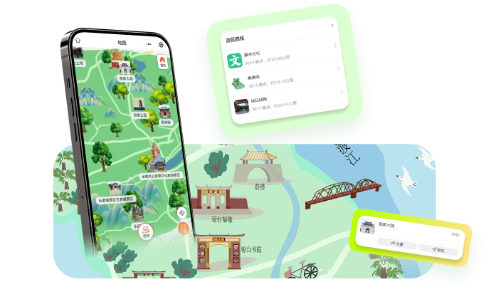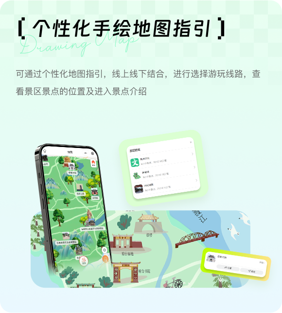 可通过个性化地图指引,线上线下结合,进行选择游玩线路,查看景区景点的位置及进入景点介绍