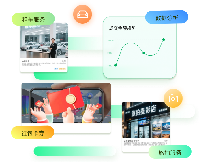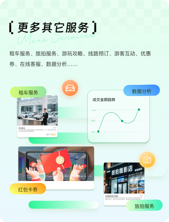 租车服务、旅拍服务、游玩攻略、线路预订、游客互动、优惠券、在线客服、数据分析……