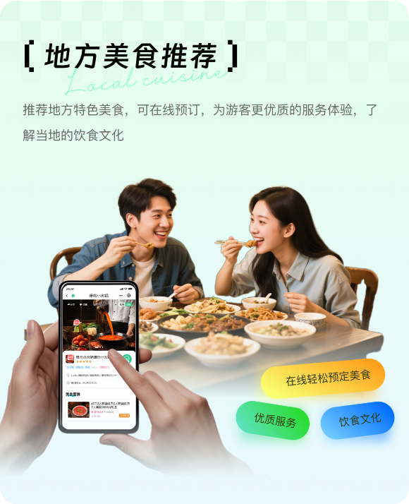 推荐地方特色美食,可在线预订,为游客更优质的服务体验,了解当地的饮食文化