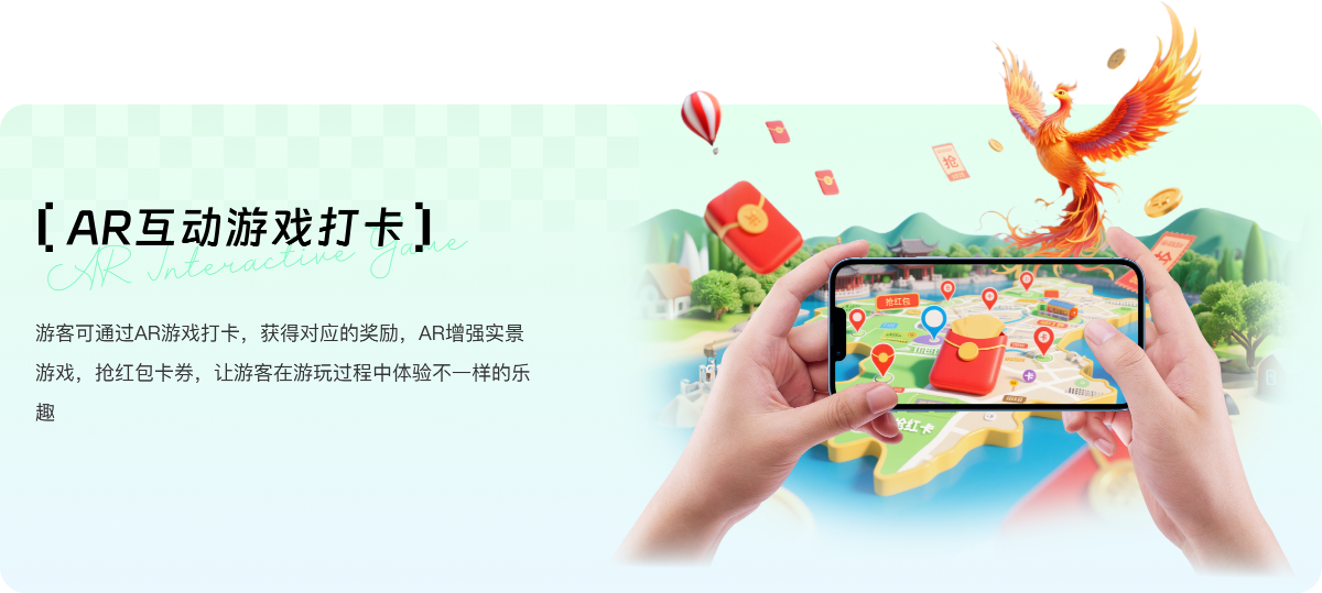 游客可通过AR游戏打卡,获得对应的奖励,AR增强实景游戏,抢红包卡券,让游客在游玩过程中体验不一样的乐趣