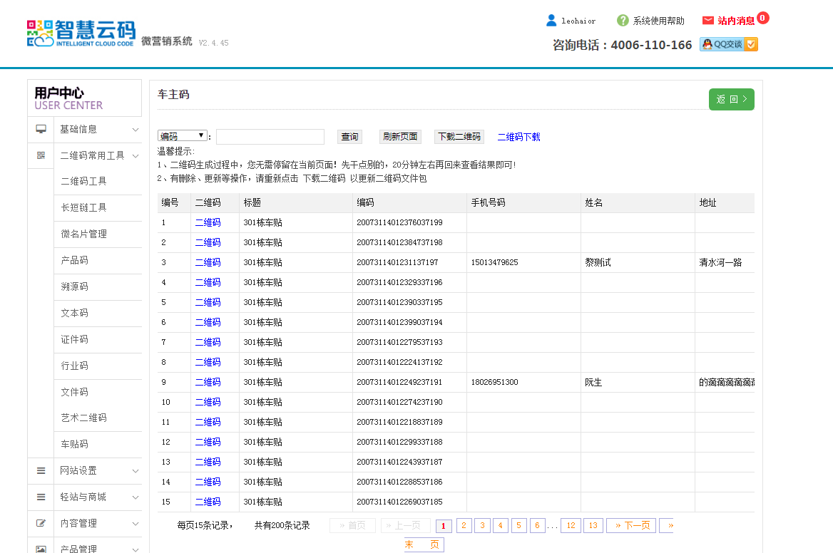 车主管理中生成车贴码,支持车主属性搜索,下载二维码等操作