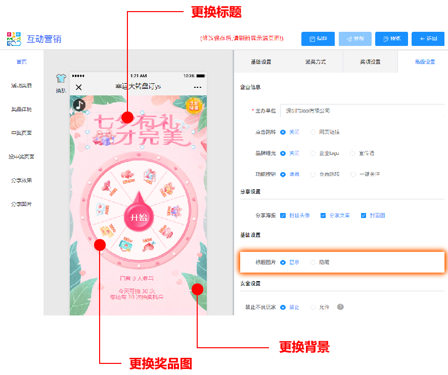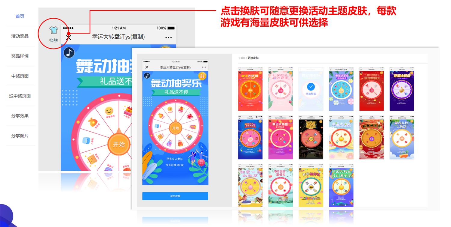 一、可视化游戏设计。摆脱固定的游戏版面,界面设计支持DIY自定义拖拉拽,可更换背景图、标题图片、奖品图等,操作灵活简单,快速植入自己的品牌元素,简单易用