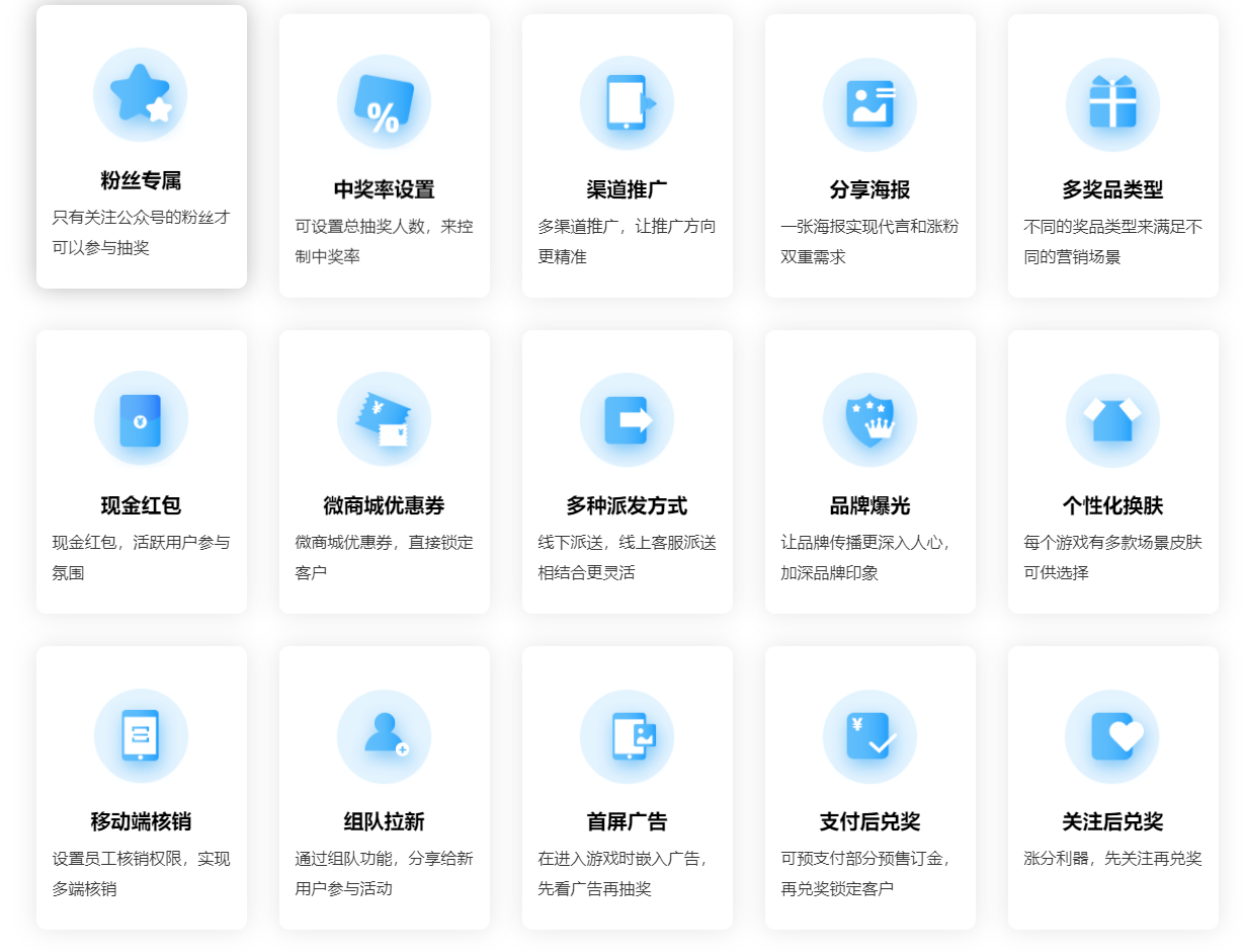 三、丰富的游戏种类及模板。系统包含抽奖类、益智类、动作类、手速类、接物类、反应类、答题类、裂变类 等多种类数十款游戏。