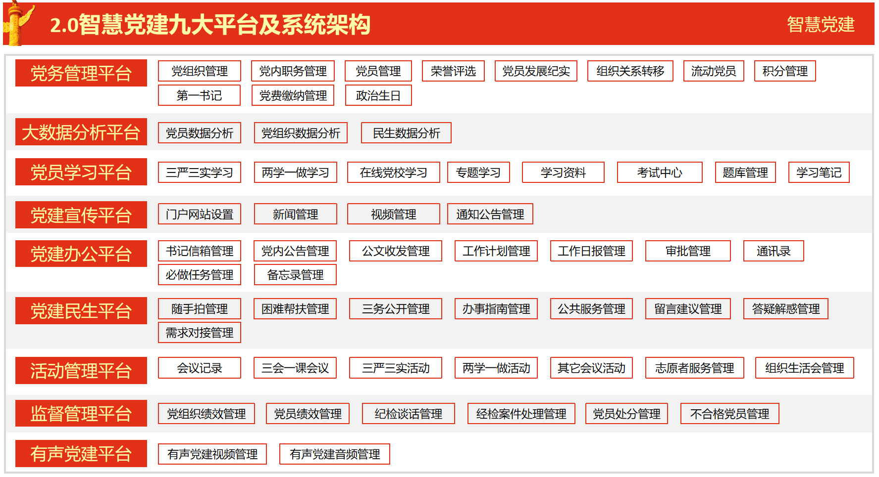 平台包含:党务管理平台、大数据分析平台、党员学习平台、党建宣传平台、党建办公平台、党建民生平台、活动管理平台、监督管理平台、有声党平台9大平台,含PC超级管理端、各级网络员PC管理端、党员中心PC端、党中心移动端、党建门户PC端、党建门户移动端、有声党建移动端、智慧电视端、智能大屏端 9大终端,满足市级以下各级政府、团队、企事业单位 党建工作需求。