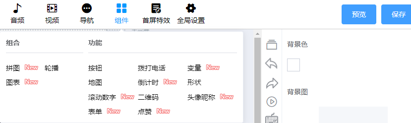 1、二期新增九大组件:导航、拼图、图表、滚动数字、表单、倒计时、点赞、变量、微信头像昵称、特效