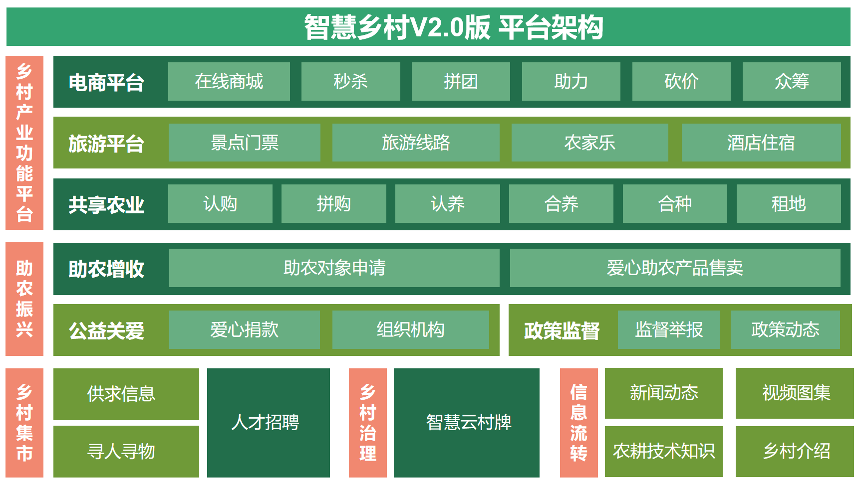 智慧的乡村系统覆盖H5、微信小程序 两大终端,包含 乡村振兴电商平台、旅游平台、共享农业、助农增收、公益关爱、乡村集市、美丽乡村、村牌村事 8大版块。