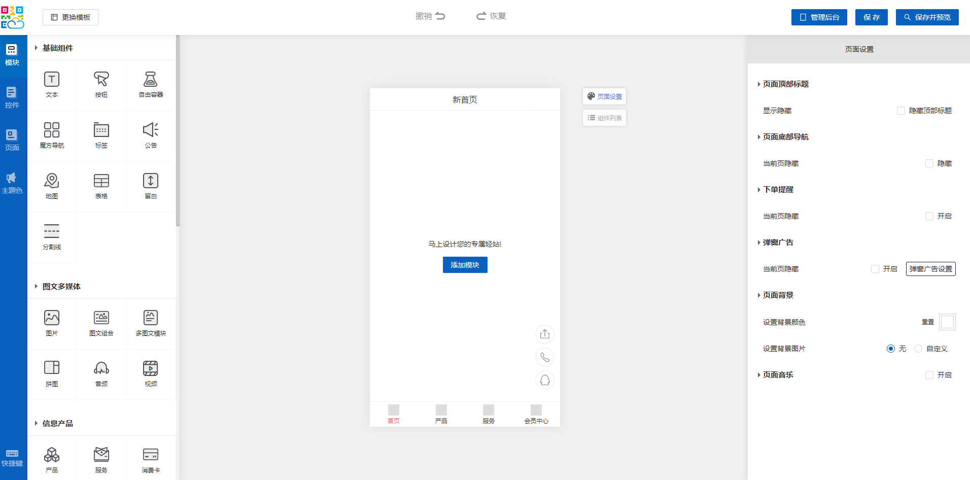 智慧乡村可视化编辑器,共有基础组件、图文多媒体、信息产品、营销模块、行业组件等五大类,共有42个组件,装修灵活易用