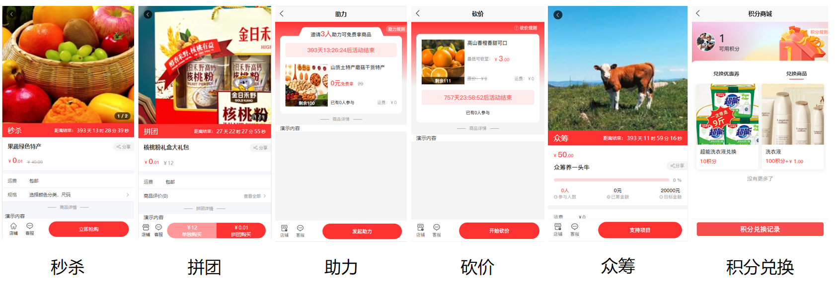 3、功能齐备的电商平台。V2.0版提供全功能电商平台,支持实物、虚拟物品、服务等多种商品,集成秒杀、拼团、助力、砍价、众筹、积分商城 等