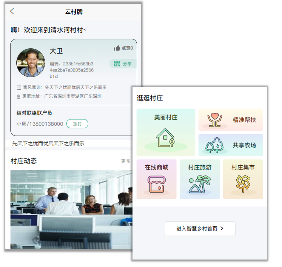 5、智慧云村牌。智慧云村牌是村民、消费者、信息平台连接的渠道。乡村村牌智能化,以家庭为单位推进数字乡村治理。协同互动,实现村庄集体信息化数据壁垒。云村牌是全面推进乡村宣传推广的前线阵地