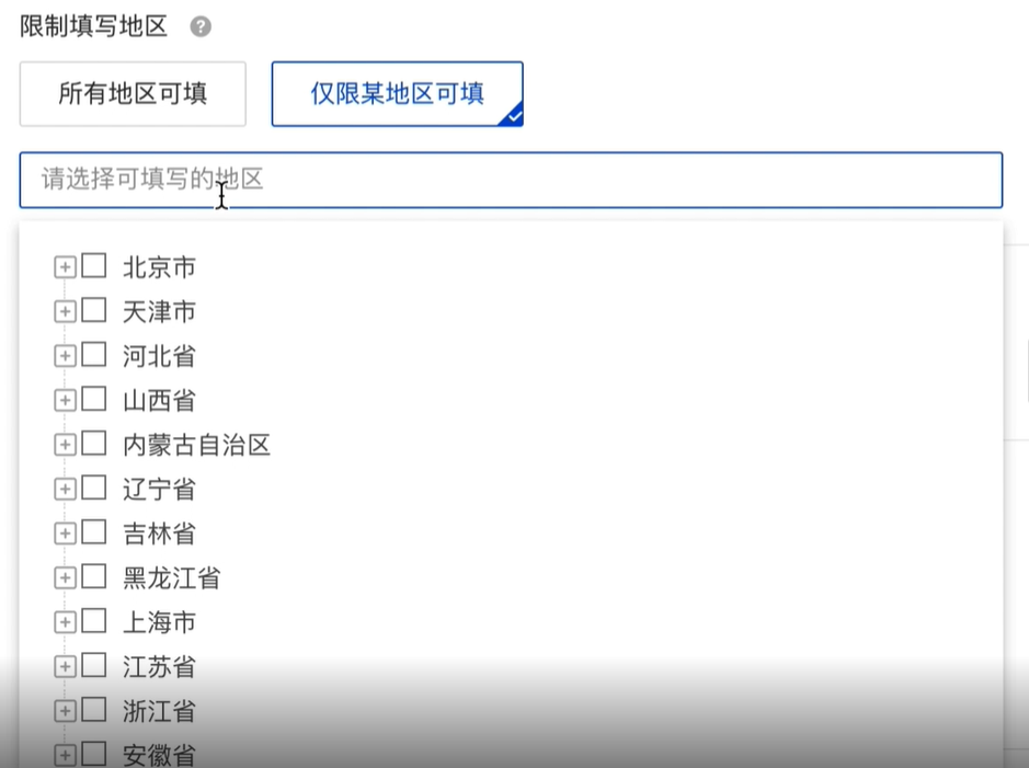 4、增加 限制填写地区 及 限填地区提示 功能,允许用户设置哪些地区可以填写此表单(以城市为单位即可,允许添加全国 或者 选择城市),如图: