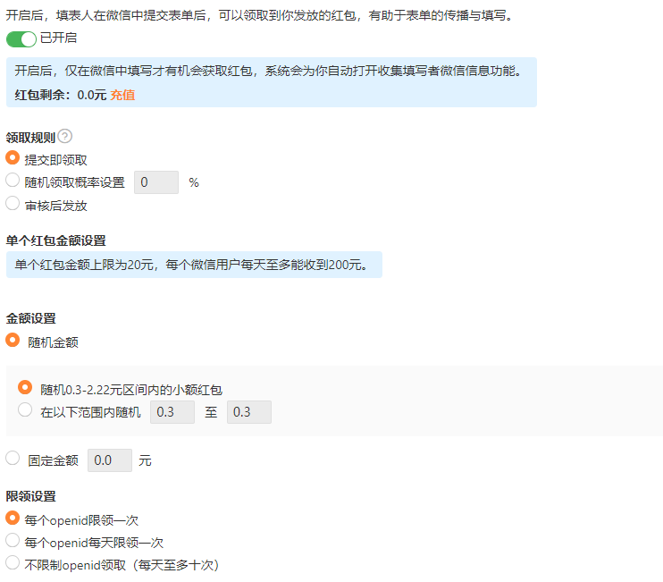 6、增加红包功能。开启后,填表人在微信中提交表单后,可以领取到你发放的红包,有助于表单的传播与填写。如图: