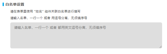 8、姓名组件,增加白名单功能,管理员在创建表单时,可预设白名单,用户在填表时,则只有白名单中的姓名可填,同时,管理员在后台,可随时查看填写人员信息。如图: