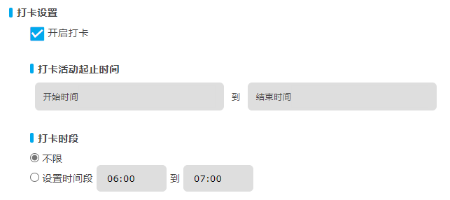 9、增加打卡功能,管理员可设置表单在某一日期段内,定时重复打卡,如下图示,如图: