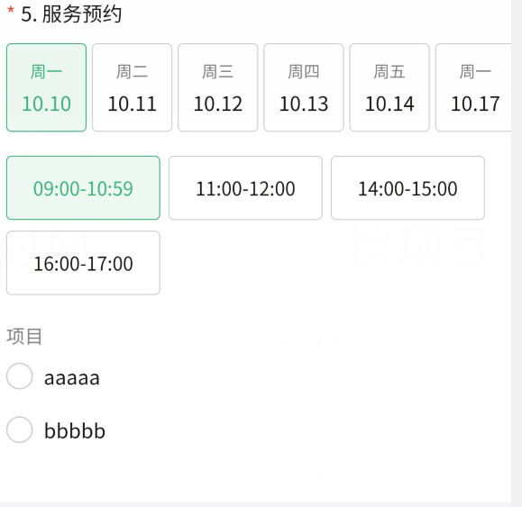 10、增加服务预约功能,可设置预约项目,预约日期,预约时间,如图: