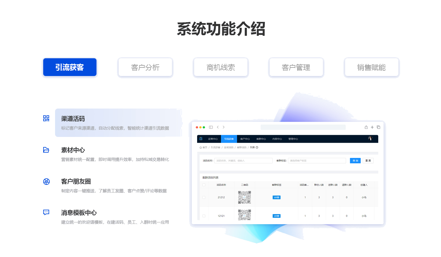 1、引流获客:渠道活码、素材中心、客户朋友圈、消息模板